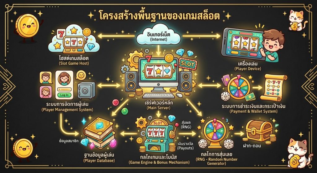 แม้เกมสล็อตจะมีหลายรูปแบบ แต่โครงสร้างพื้นฐานของเกมมักประกอบด้วยองค์ประกอบสำคัญดังต่อไปนี้